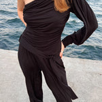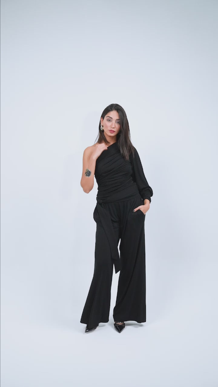 LavaNera jersey set is a 2-piece matching outfit, featuring an asymmetrical one-shoulder draped blouse and loose-fit pants. It is crafted in black, symbolizing the rich volcanic soil of the Etna Mountain. The blouse features an elegant, puffy sleeve with a refined draped cuff, underlining the garment's majestic design. The loose pants have a high-waist fabric belt that can be spread or folded based on your preference. The LavaNera ensemble offers a comfortable set that will enhance your fashion experience during daily activities and night-outs.