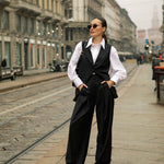 Liza pants in a timeless dark black color add a touch of classic elegance to any outfit. Expertly tailored, they provide a comfortable fit for all-day wear, whether in a business setting or during leisure activities. This pants effortlessly bridges the gap between professional attire and casual elegance, making it an essential choice for those who value both style and functionality. The rich black hue ensures it remains a timeless and adaptable addition to your wardrobe, adaptable to various personal styles and settings.