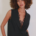 The Liza waistcoat, a timeless classic with a modern twist, comes in a striking black shade and open back design. Its tailored fit beautifully accentuates the wearer's silhouette, offering a sharp and polished look. This suit is versatile, perfect for a range of events, from formal business meetings to more casual outings.