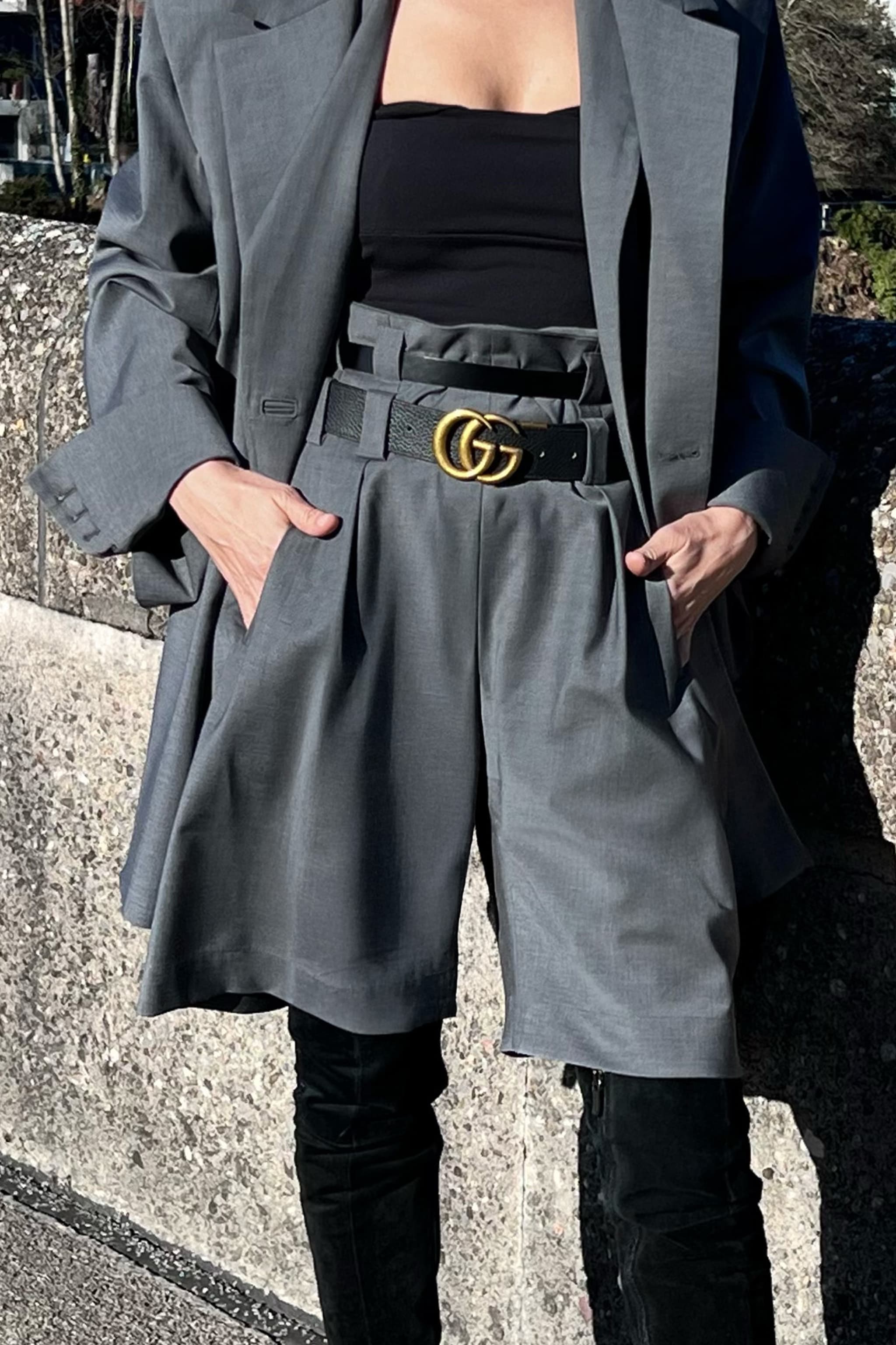 Sophia bermuda shorts in classic grey wool gabardine embody calm resolve and intellectual elegance as a visual code of modern dressing.