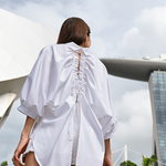 A white open-back shirt like no other - Prima Aurora dell’Etna. Inspired by the Aurora dell'Etna butterfly, which resides in the foothills of Mount Etna, this shirt blends style and comfort seamlessly. Gentle organic cotton provides ultimate comfort, while the butterfly's delicate elegance is reflected in the unique design with graceful 'wings.' The distinctive design of this blouse, featuring puff sleeves and a drawstring cutout, will accentuate your outfit at any occasion.