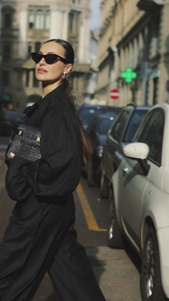 The Protagonista blouse is a long-sleeved piece characterized by the pussy-bow necktie. In a deep black color, the blouse creates an enigmatic ambiance expressed through its mesmerizing design, particularly in the ruffle cuffs that accentuate the volume of the airy sleeves. The necktie can be worn without a bow, creating a new mood for the garment. Perfect for casual wear, the Protagonista is made from lightweight, breathable, luxurious Tencel fabric that provides an exceptionally smooth feeling against the skin.