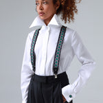 The suspenders contain elements that allow them to be used in two ways: metal clips at the end of the straps attach the suspenders to trousers, or leather loops that fasten the suspenders to buttons on the pants.