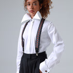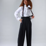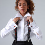The suspenders contain elements that allow them to be used in two ways: metal clips at the end of the straps attach the suspenders to trousers, or leather loops that fasten the suspenders to buttons on the pants.
