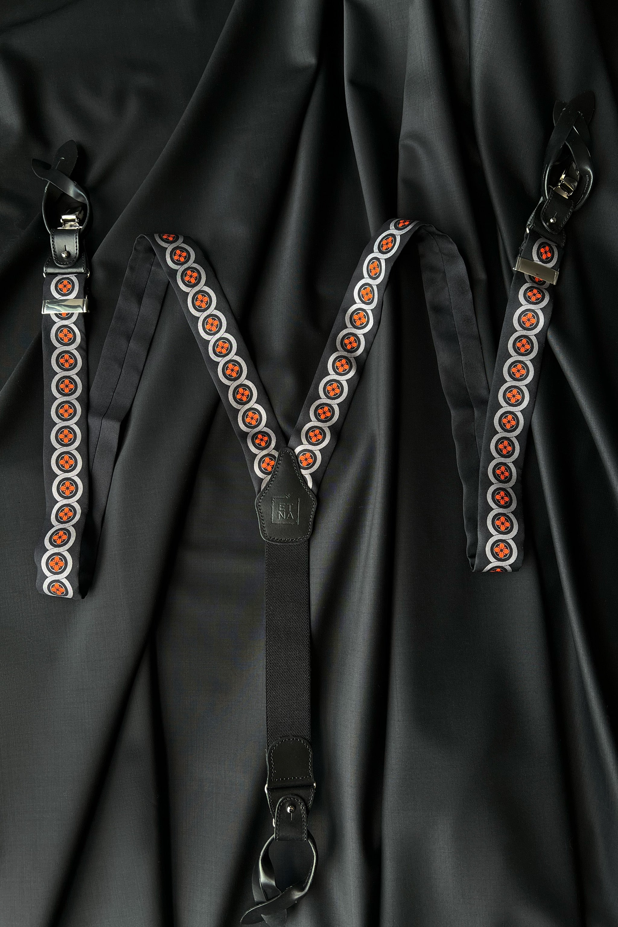 Handmade in Como Italy, Sicily orange floral Etna patterned silk suspenders designed from 100% silk. The floral pattern transports us to the heart of Mediterranean elegance - where endless meadows are immersed in the scent of blooming herbs, where every step through the garden awakens memories of eternal spring, and where an evening spent on the terrace of a historic Italian villa fills the soul with warmth and the legacy of refined craftsmanship.