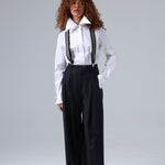 The suspenders contain elements that allow them to be used in two ways: metal clips at the end of the straps attach the suspenders to trousers, or leather loops that fasten the suspenders to buttons on the pants.