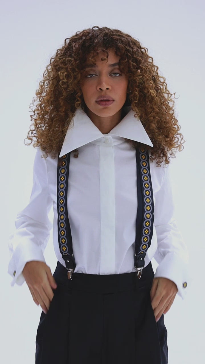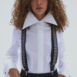 ETNA suspenders have the perfect classic width: 3.5 cm (1 3/8 inches) and minimalist precision-crafted metal adjusters suiting any body type and height flawlessly. Such width will always fit perfectly with any bottom, whether wide or classic pants, as well as with any top, whether slim or oversized shirts. The suspenders contain elements that allow them to be used in two ways: metal clips at the end of the straps attaching the suspenders directly to trousers, or leather loops that fasten the suspenders to special buttons on the pants.